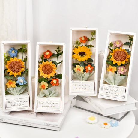 ギフトボックス入りの手作りかぎ針編みのひまわりブーケ吊り下げ装飾・デスクトップディスプレイ・お友達への心のこもったギフトに最適です
