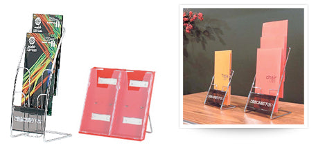 テーブルやカウンター、棚の上などの小さなスペースに展示できるカタログラックです。お客様の目線に近い位置にカタログやチラシ、リーフレットなどを置けるため、手に取っていただきやすいのが特徴です。様々なタイプのものがありますのでお好みの商品をお探し下さい。