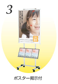 カタログスタンドとポスター掲示が一緒になったタイプ。ポスターでお客様の興味をひき、パンフレットを取っていただけます。