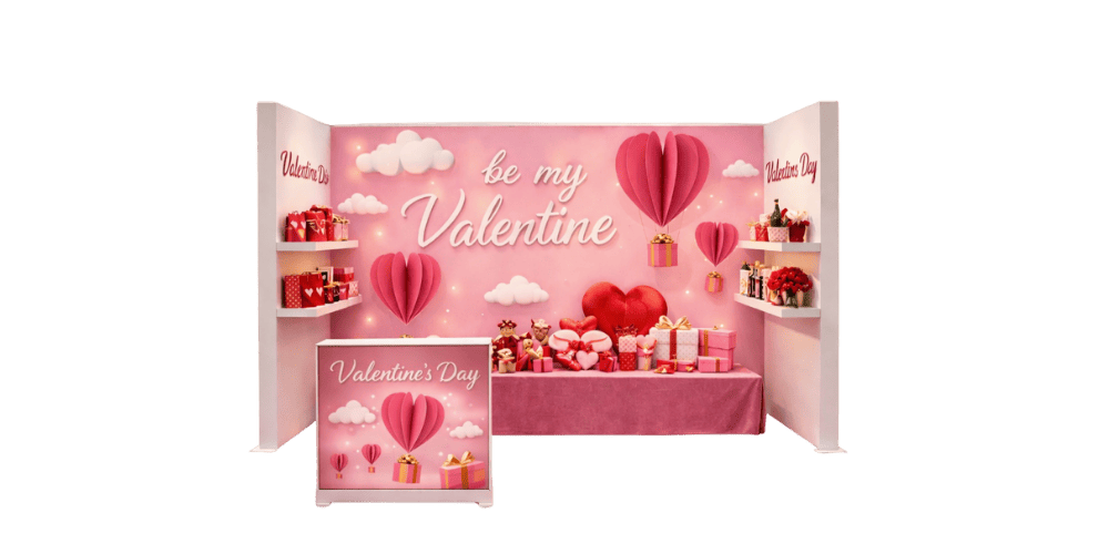 商業施設の特設会場、催事スペース、ポップアップショップなど、セールを伴うバレンタインイベントに最適な装飾セットです。