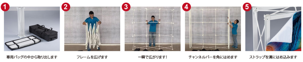 フレームを広げてチャンネルバーで固定し、スクリーンを取り付けるだけの簡単仕様。連結部分もコネクタパーツで繋げるだけなので、手間なく容易に設置できます。