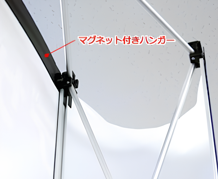 スクリーンの裏側上部に貼付加工したマグネット付きハンガーが、本体フレームの横方向を固定します。スクリーンはマグネットの貼付加工ですが、ケース印刷はマジックテープ加工となります。