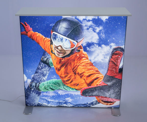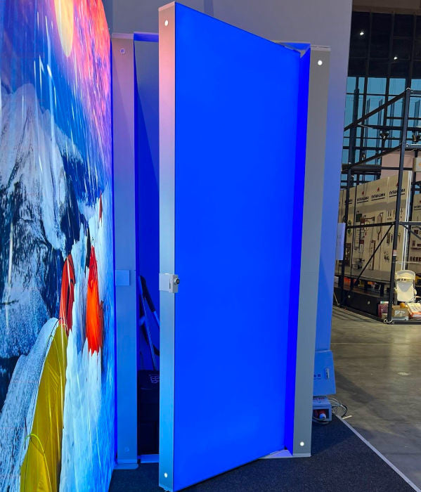 サイズ展開が豊富なので、組み合わせ次第でいろんなサイズやデザインのパネルを作ることができます。本体フレームに内臓されているLEDライトがスクリーンを美しく彩ってくれます。フレーム自体も軽く、工具なしで簡単に組み立てることができます。超薄型の両面仕様なので置く場所を問わず宣伝効果を発します。
