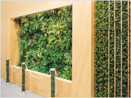 商業施設のパーテーションにランダムに配置したグリーンパネル。好きな位置に設置してボリューム感を演出