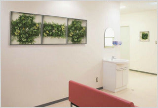 クリニックに配置したアクリルカバー付のグリーンパネル。連結使用で清潔感のある空間に演出。