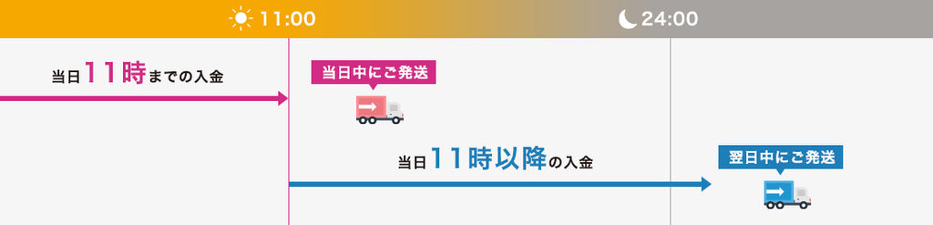 明日欲しいとき、11:00 までにご入金確認できれば当日発送可能です。お急ぎ料金なしで、お客様のご要望に応えます。