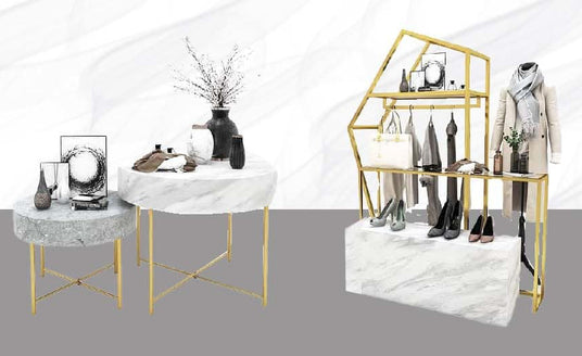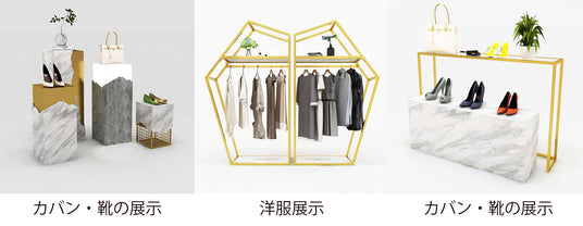 アパレルショップ・ブティックに最適な、アパレル用ハンガー什器、業務用ハンガーラック・シェルフ・ディスプレイ用のテーブル・陳列棚・物品棚・ディスプレイ ラック ゴールドなどアパレルショップなどで使用されるアパレル什器を集めました。誉PRINTINGのハンガー什器はどのアイテムも形状が特徴的で、並べ方によって全くイメージが違ってきます。オーナーのセンスを生かしたオリジナリティ溢れる空間を作り上げることができます。アンティーク感・高級感が感じられる大理石調のテクスチャが、他店とは違う雰囲気作りに役立ちます。細部にまでこだわった誉PRINTINGのハンガー什器、業務用ハンガーラック、ディスプレイ 棚をぜひご利用ください。