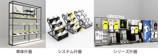 スニーカーショップ・ブティックに最適な、おしゃれに陳列・展示できるアパレル用什器。靴・サンダル・洋服・バッグ・帽子など展示にお使いいただける豊富なアパレル用ディスプレイ・店舗什器を取り揃えています。靴・スニーカー・雑貨などを単品陳列で使用できる【単体什器】、お店のテイストや広さに合わせて組み合わせて使える【システム什器】、デザインや素材を統一した什器を取り揃えた【シリーズ什器】など、デザイン性の高いアパレルディスプレイ什器(商品ディスプレイ棚/オープンラックディスプレイ)の事なら誉PRINTINGにお任せください。
