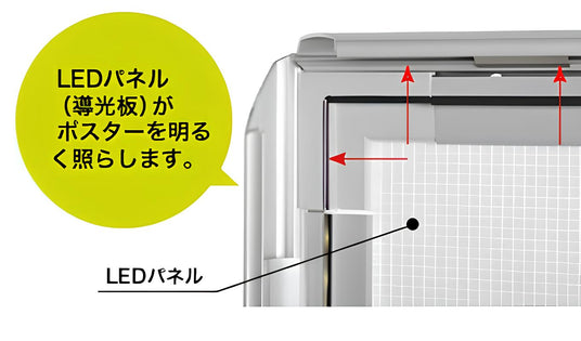 通常のポスターパネルとの違いは、やはり光ること。ポスターパネルの背面にLEDパネル(導光板)をセットすることで、展示物を明るく、より効果的に見せることができます。