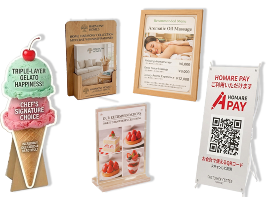 紙素材で作られた卓上POPは、軽量で扱いやすく、イベントや期間限定キャンペーンに最適です。低コストで制作できるため、シーズンごとにデザインを変更したり、複数のテーブルに設置したりと柔軟な運用が可能です。また、環境配慮型の素材を使用することで、エコ志向の店舗イメージをアピールできる点も魅力です。