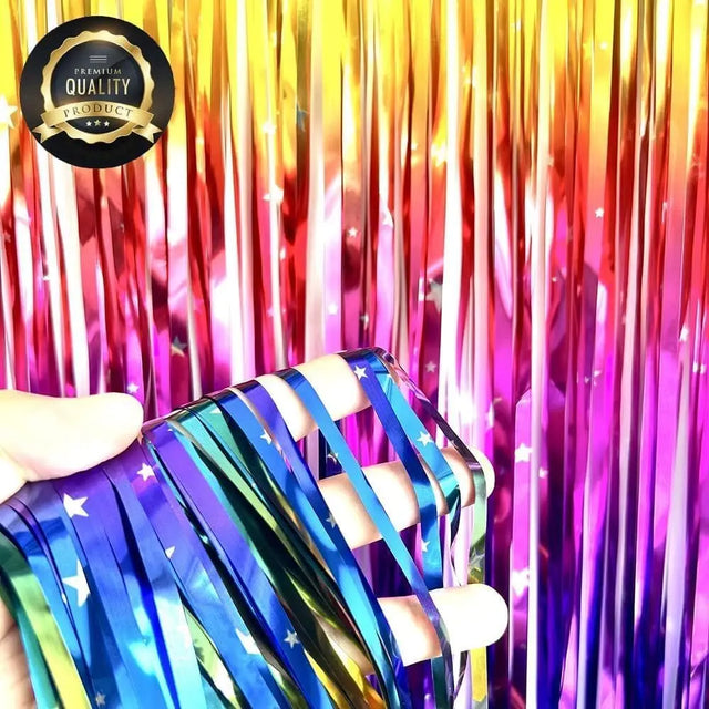キラキラと輝くレインボーグラデーションのティンセルカーテンは、パーティーを華やかに彩るデコレーションアイテムです。