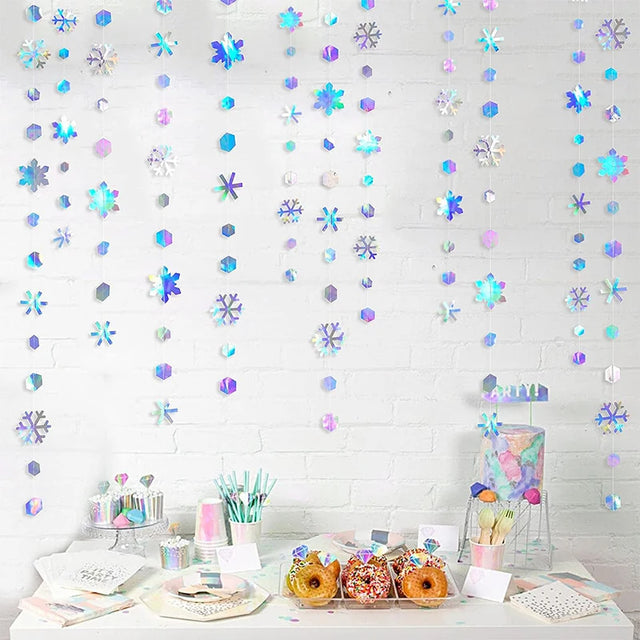 4mの虹色スノーフレークガーランドは、クリスマスや誕生日パーティーにぴったりの華やかな吊り下げ装飾です。