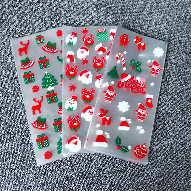 クリスマスの贈り物やパーティーに最適な、サンタクロースや雪の鹿がプリントされた透明なビニール製クッキーバッグ50枚セットです。