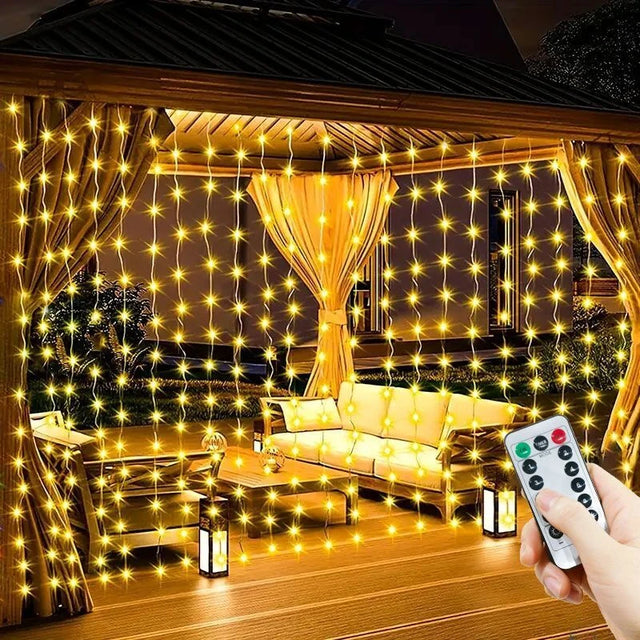 リモコン操作が可能なUSB接続のLEDカーテンライトで、室内外のデコレーションを手軽に演出します。