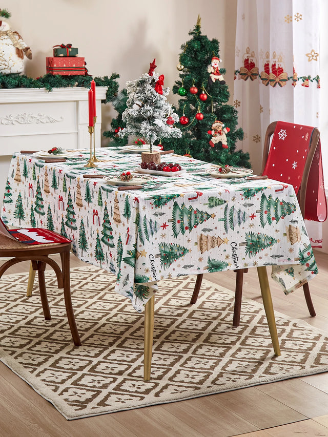 冬の雪をイメージしたデザインが特徴の、洗えるポリエステル製クリスマステーブルクロスです。