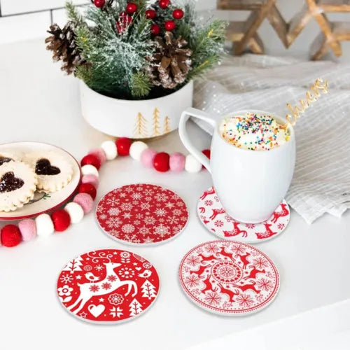 環境に優しい素材で作られた、トナカイ柄が施されたクリスマスにぴったりのドリンクコースターです。