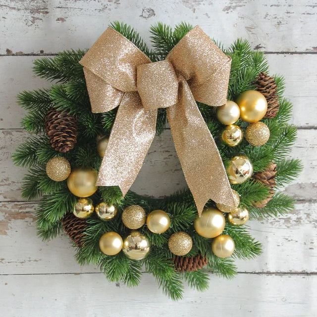 華やかなリボンが彩るクリスマスデコレーションリースで、ホームドアやウィンドウを華やかに演出します。