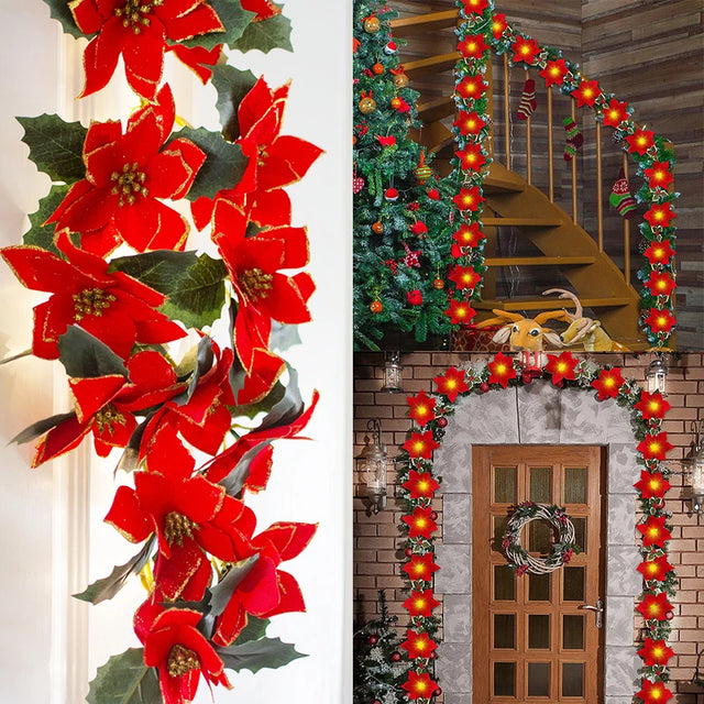 ポインセチアの花をモチーフにした2mのLEDガーランドライトで、クリスマスやホームデコレーションに最適です。