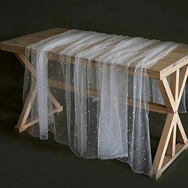 結婚式や特別なイベントにぴったり!カワイイパール付きシフォン生地のテーブルランナーです。