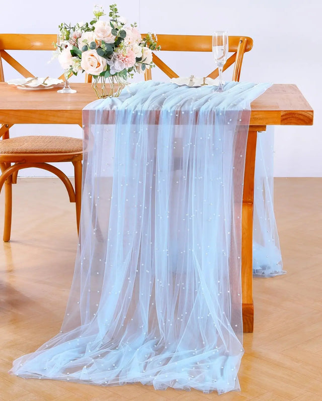 ロマンティックな雰囲気を演出するパール付きチュールのテーブルランナーは、結婚式やベビーシャワーに最適です。