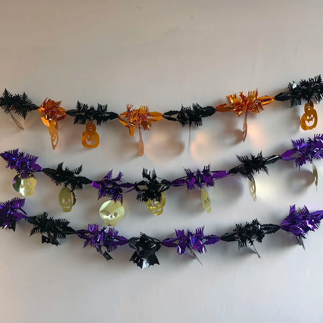 ハロウィンにぴったりなゴースト、コウモリ、カボチャ付きのキラキラ輝くガーランドセットです。