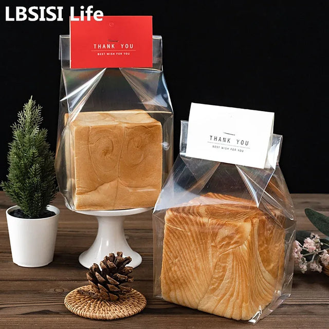 手作りパンやスイーツの包装に最適な、トレイ付きの自立式トーストバッグ50枚セットです。