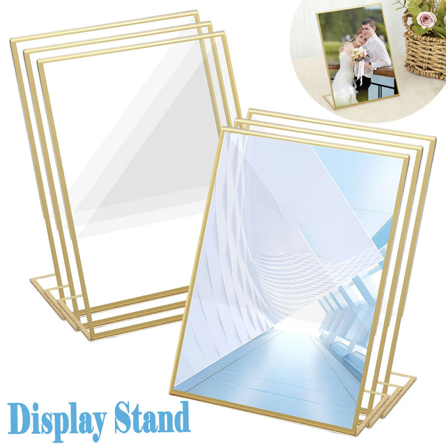 エレガントなゴールドフレームデザインのアクリルサインホルダーで、テーブル上のディスプレイを美しく演出します。
