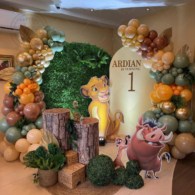 ライオンキングをテーマにした115個入りのバルーンアーチキットは、子供の誕生日パーティーにぴったりの装飾アイテムです。