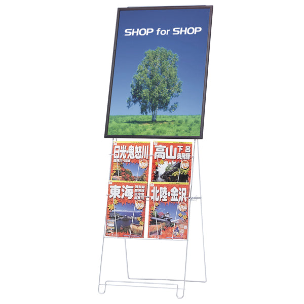 ポスター掲示とパンフレット配布を1台で同時に行える「パネル付スリムパンフレットスタンド(PR-240)」です。