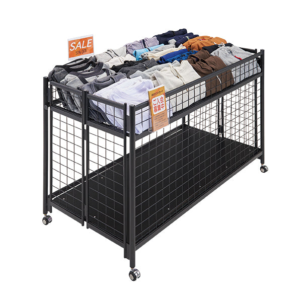 幅1200mmのワイドサイズで大量陳列が可能な「中折れワゴン ネットタイプ(黒 W1200)」です。