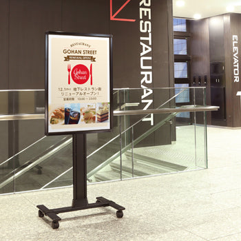 移動に便利なキャスター付き片面パネルスタンド。ショッピングモール、オフィス、駅、ホテルなどの施設での広告掲示やイベント告知、メニュー表示に最適です。カタログラック取付オプションで、パンフレットやチラシの配布も可能になります。