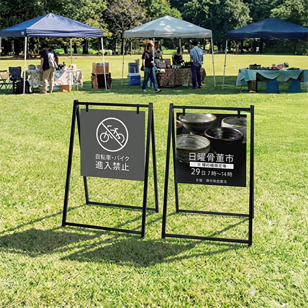 フレームレスタイプの抜け感がオシャレなスタンド看板です。スリムなデザインで面板が引き立ち、店舗の案内全般におすすめです。折りたたみ式のため、日々の移動や収納も手軽に行えます。